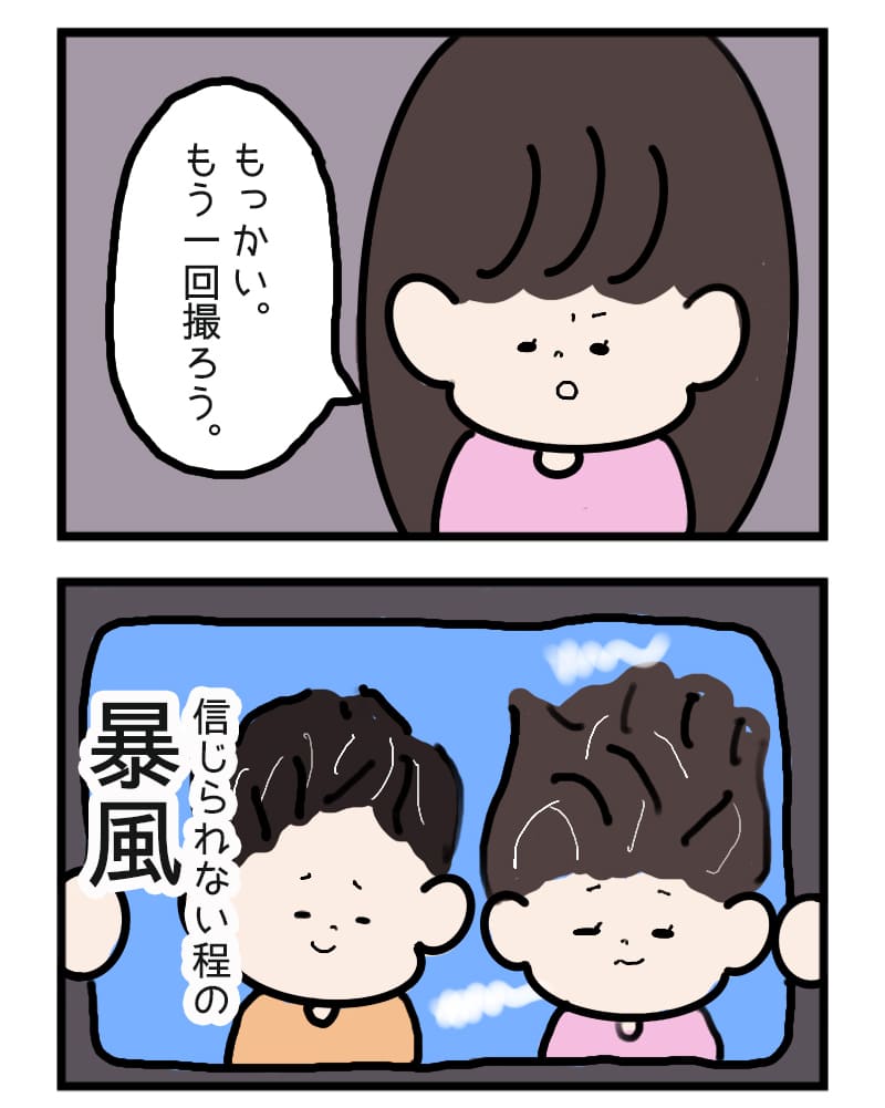 前髪紛失の写真をパシャリ。二人とも新しい斬新な髪型の写真がとれた。この風量いいな。お風呂上がりの髪の毛乾かすのに最高だと思う。(強風で3分ぐらいで乾きそう、、、、)