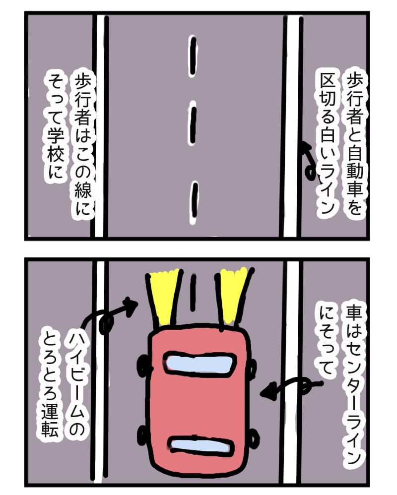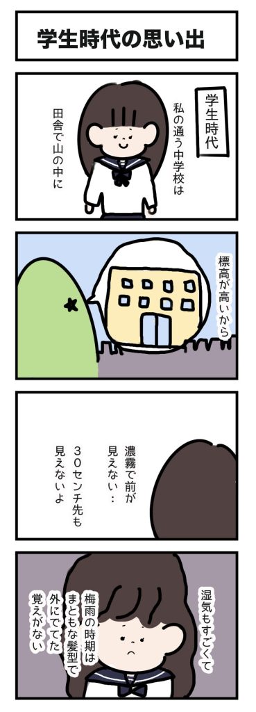 通学の時は命懸け。車に轢かれないように目立つところを歩き、自衛。濃霧の時は車も10~20キロのトロトロ運転だから、車で通学しても死ぬほど時間がかかる。