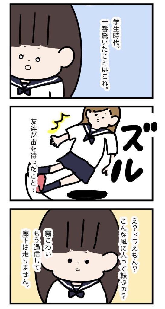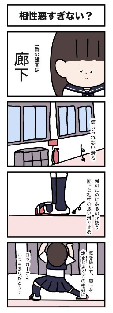 ☆☆☆☆☆おまけ☆☆☆☆☆なんであんなに上履きと廊下の相性が悪かったのか、、、いや、普段は悪くないもんな、、、、霧で発生した水のせいか、、霧はどうしようもないから滑らない、転ばない技を身につけるしかないけど、私には無理だった。