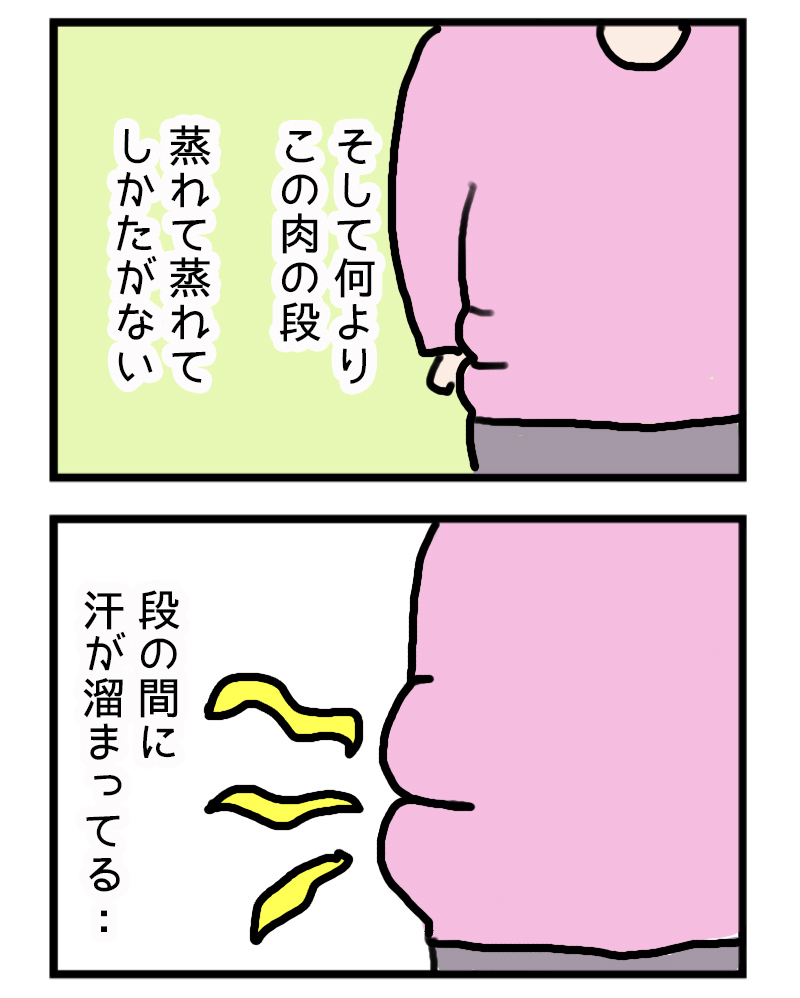 身体が重くなるに従って、身体に肉の鎧がつき始めた。夏にこの鎧はいらない、、、、肉と肉の間が水浴びでもした?っていうぐらいびしょびしょに、、、