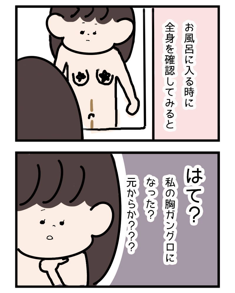 お胸の色も黒く、、、、あれ?もともと?自分の色なんて覚えてない、、、 これ、出産したら治るのかな???